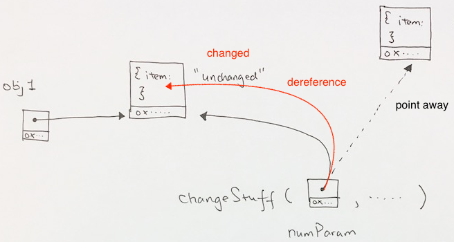 function changeStuff(numParam) { numParam = {item: "changed"}; // points away } var obj1 = {item: "unchanged"}; // object with item as property changeStuff(obj1); console.log(obj1.item); |