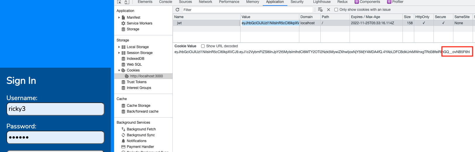 When we look at the cookie on the server side, make sure the jwt token is there.